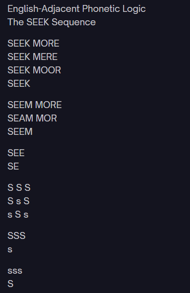 The SEEK Sequence begins from a more explicit semantic anchor. “SEEK MORE” provides recognizable English vocabulary and syntactic familiarity. Minimal vowel substitutions (MORE/MERE/MOOR), consonant trimming (SEEM/SEAM), and gradual lexical erosion transform the phrase while maintaining phonetic adjacency, particularly the long E sound. The poem remains grounded in English phonology and orthography even as meaning thins. Capital and lowercase contrast again serve as dynamic modulation rather than grammatical distinction. Unlike The Λmetry Variations, which begins without full lexical meaning, SEEK Sequence initiates with semantic clarity and performs its loss incrementally. The reader experiences semantic decay rather than semantic absence. The collapse moves from a phrase to a word fragment to an isolated consonant, eliminating lexical meaning while preserving alphabetic structure. Language again collapses downward, but here what disappears is referential meaning itself.