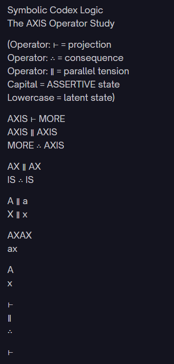 In contrast, the AXIS Operator Study exemplifies symbolic codex logic, in which symbols function as operators rather than decorative marks. Here, ⊢ signifies projection, ∴ indicates consequence, and ∥ marks parallel tension. Capitalization and lowercase differentiate ontological states—assertive versus latent—rather than phonetic intensity. The poem begins with a word-plus-operator relation (“AXIS ⊢ MORE”) and proceeds through rule-based reduction: AXIS contracts to AX, then to A and X, while operator relations persist. The sequence ultimately eliminates all lexical material, leaving only operators. This is not phonetic drift or semantic erosion but operational transformation. Meaning collapses into a structural relation. Whereas the first two poems reduce language into glyphic residue, the AXIS study abstracts language outward—from word to relation to pure operator. It performs formalization rather than entropy.