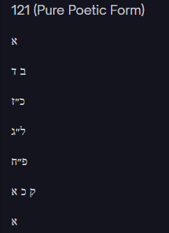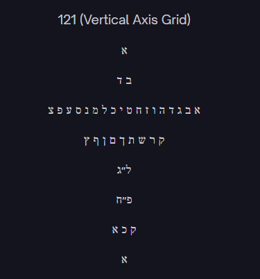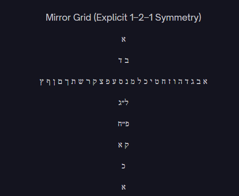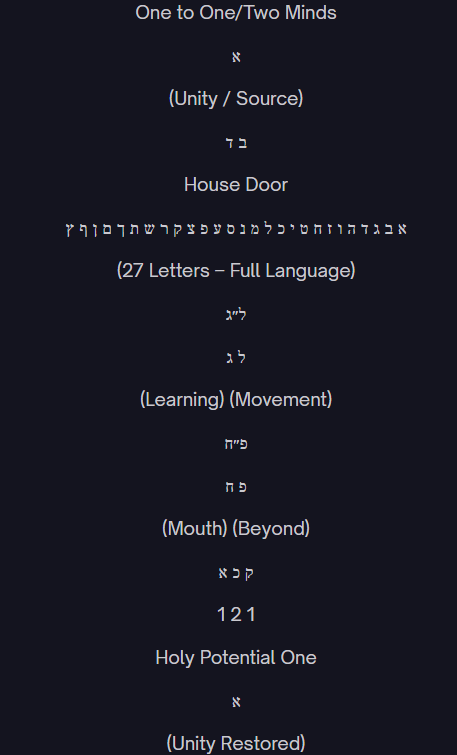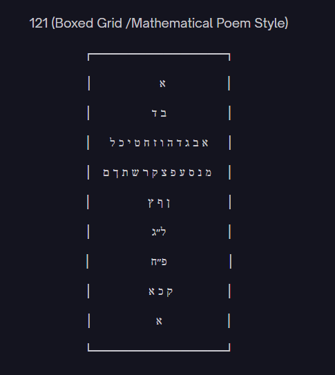 This pattern reflects the deeper structure already present in the earlier equation. Two (house) and four (door) open into twenty-seven (language). Language becomes thirty-three (promise fulfilled through structure). Promise expands through eighty-eight (cosmic doubling or renewal). The result is 121, the return to unity with greater fullness. The poem’s typographic grid, when arranged symmetrically, visually enacts this movement: a single Aleph at the top and bottom, with layers of structure in between. The mathematics becomes architecture. The numbers do not only calculate; they build.