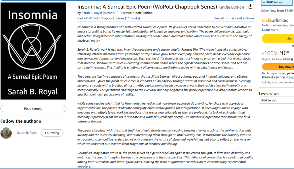 Sarah B. Royal continues to expand the possibilities of poetic form, offering readers a deeply personal yet universally resonant experience. Her writing is a testament to the power of creative risk, intellectual depth, and emotional authenticity.