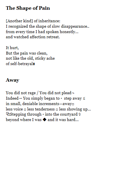 Sarah B. Royal continues to expand the possibilities of poetic form, offering readers a deeply personal yet universally resonant experience. Her writing is a testament to the power of creative risk, intellectual depth, and emotional authenticity.